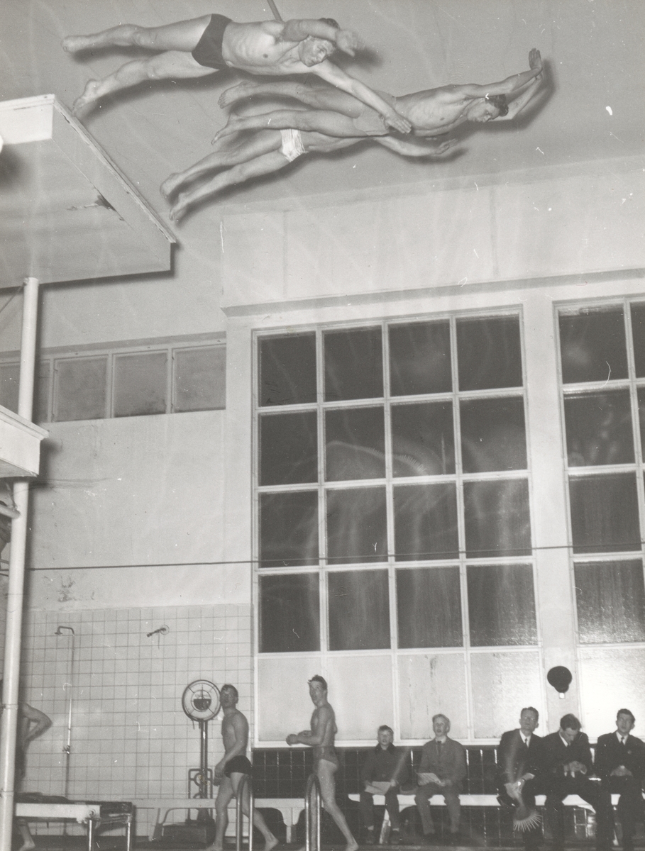 Tre unga män dyker samtidigt från trampolin i simhall. Nedanför går tre män och tittar upp mot de dykande männen.