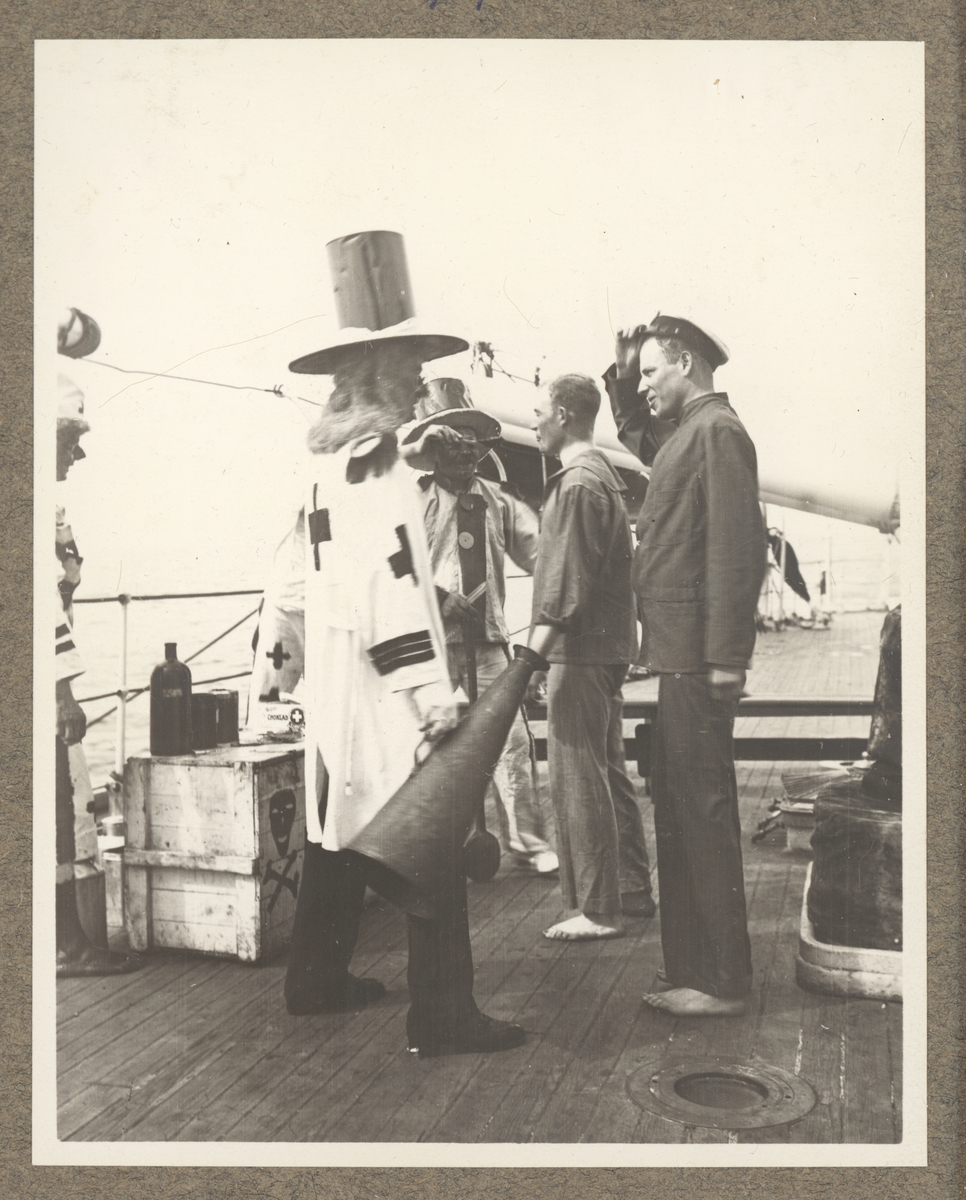 Titel: Läkaren och en medhjälpare utför sina tjänster mot två sjömän under linjedopet.