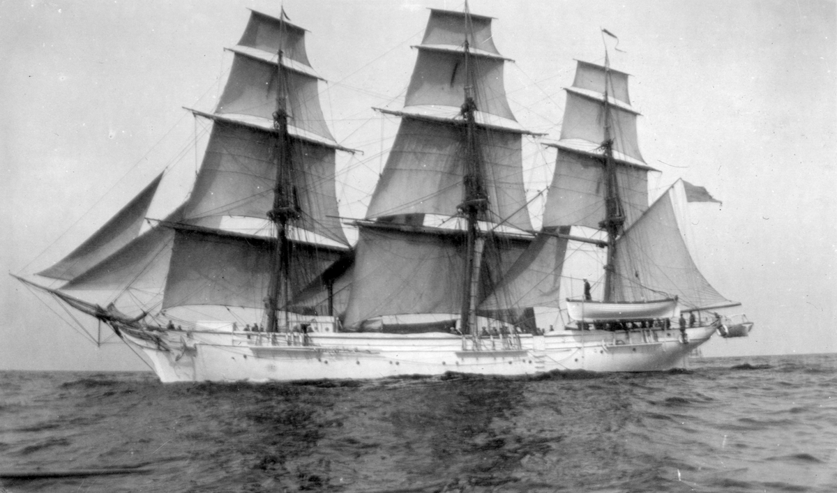 Titel: Najaden på havet sedd från sidan med fulla segel.