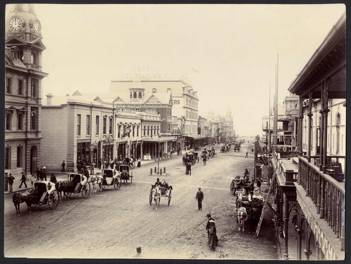 Titel: Bilden visar Adderley Street i Kapstadens centrum. I centrumet står Stuttafords varuhus.