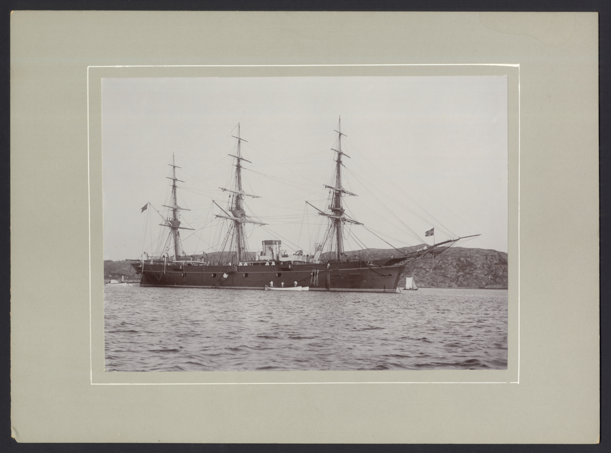 Bilden visar ångkorvetten Freja till ankars 1896 i Strömstad. Två barkasser ligger långsidas på styrbordssidan.
