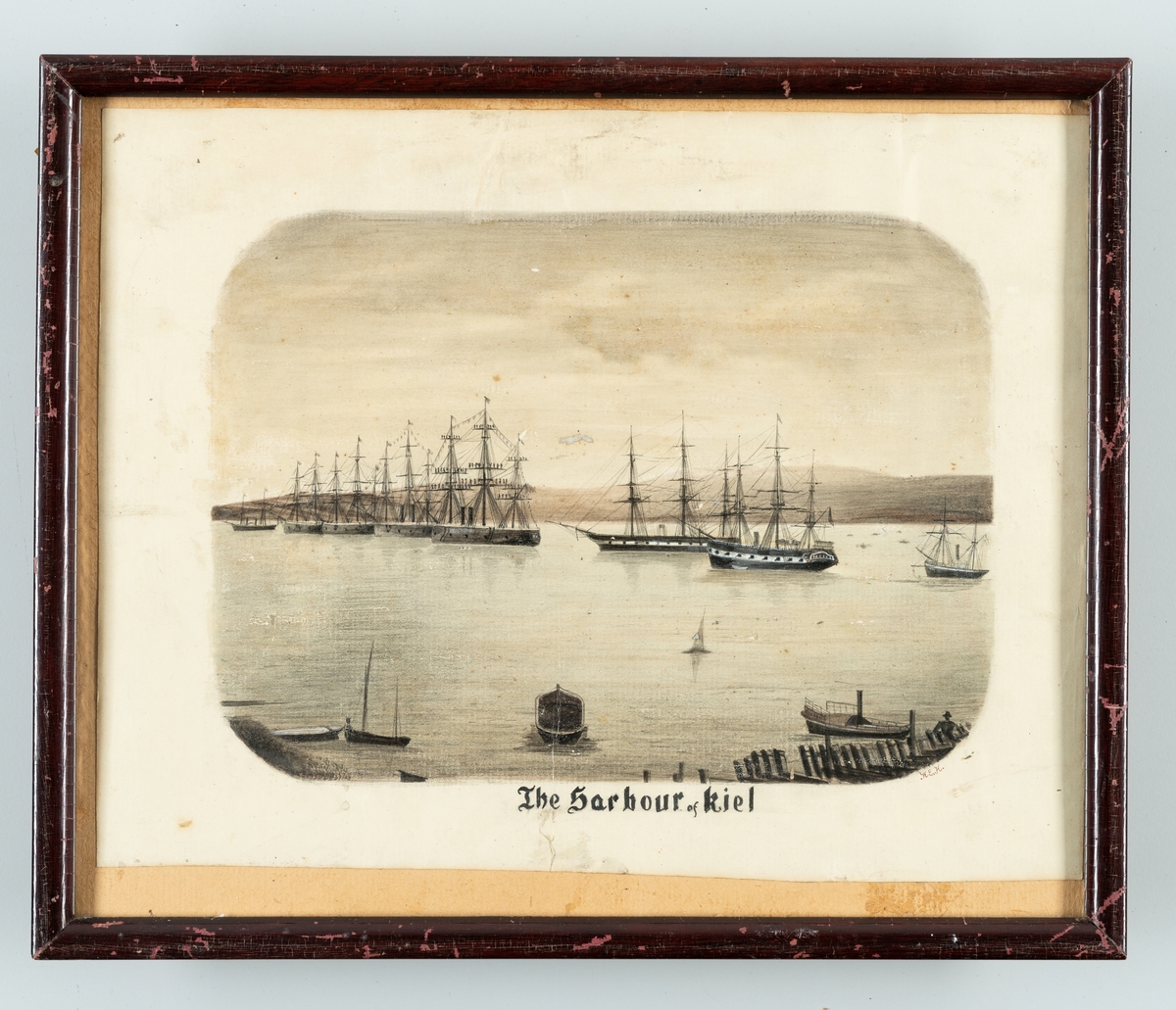 Titel: Denna målning visar tyska örlogsfartyg till ankars i Kiels hamn.
