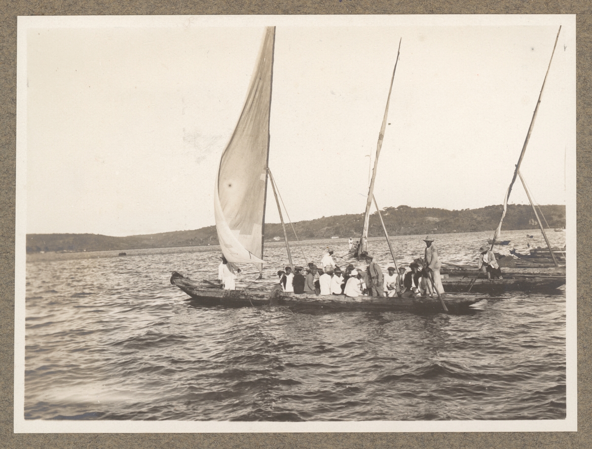 Titel: Bilden visar en rad enkla segelbåtar med passagerare nära kusten i Bahia.
