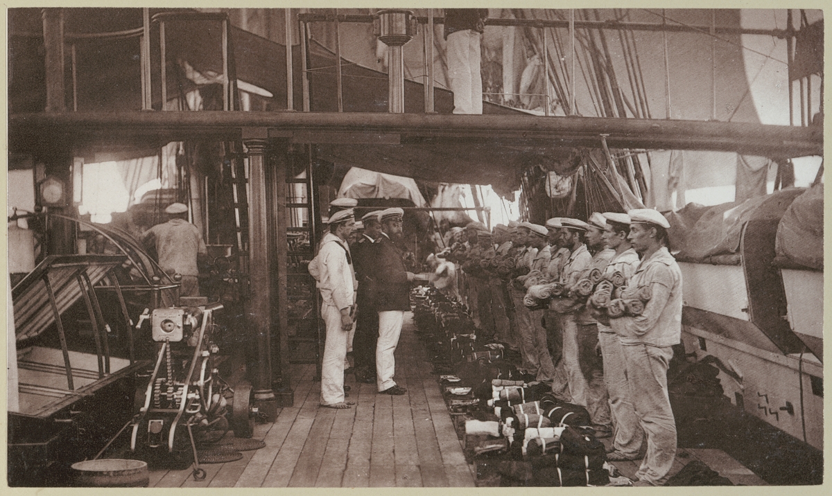 Bilden förställer tyska sjömän ombord på korvetten Stosch som har tagit uppställning för inspektion av kläderna. Det är den del av rutinerna för den personliga hygienen ombord.