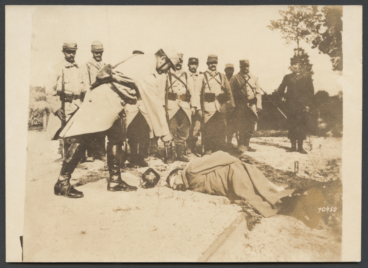 Bilden visar hur en soldat i fransk uniform siktar med en pistol på huvudet av en man som ligger på marken. Hans hjälm har ramlat av. Mannen bär en ögonbindel och i bakgrunden syns en grupp soldater med gevär i giv-akt ställning. Det är oklart om det är en avrättningskommando som redan har skjutit mannen eller om man ser momenten före avrättningen genom soldaten i förgrunden.