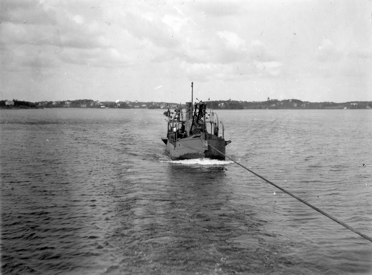 Titel: Bogsering av båt med hjälp av en lina till sjöss. I bakgrunden syns land.