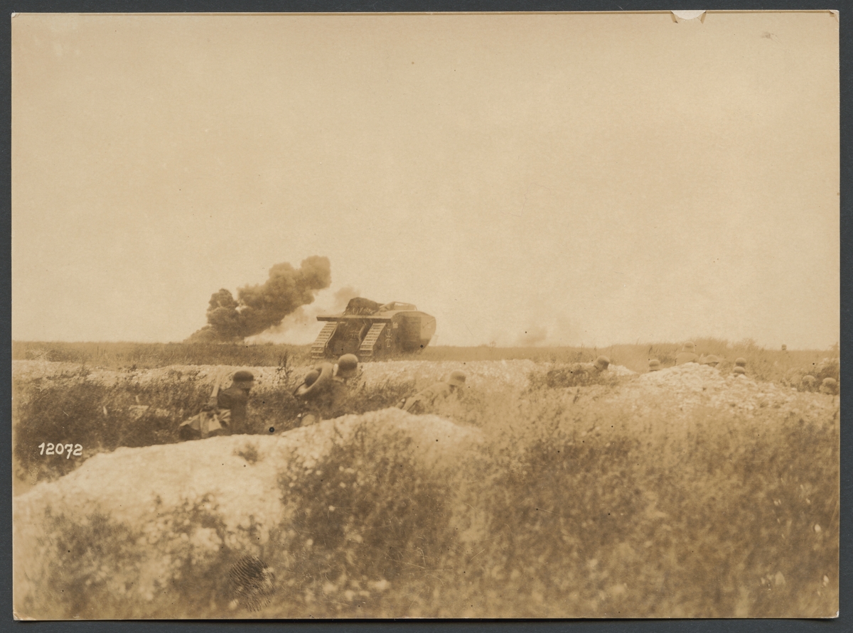 Bilden visar soldater som tar skydd i en skyttegrav och iakttar en stridsvagn som rör sig på slagfältet. Det syns flera explosioner från artillerield.