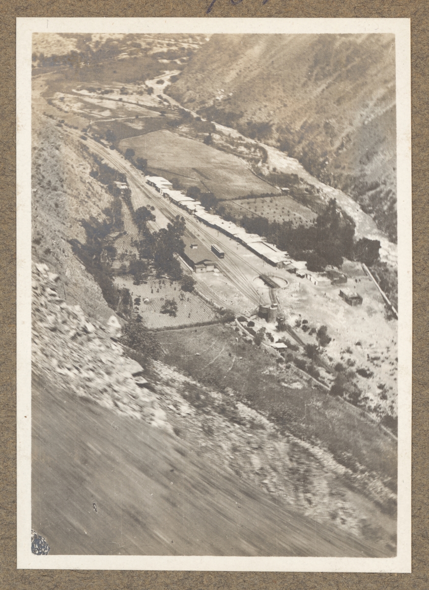 Titel: Vy över en dal med järnvägsanläggningar och en tågstation.