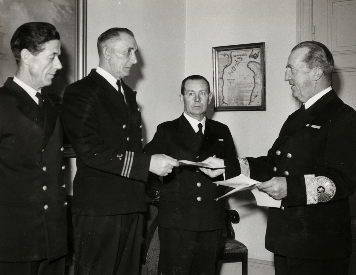 Titel: Äldre sjöbefäl i sällskap om fyra under utdelning av medaljer.