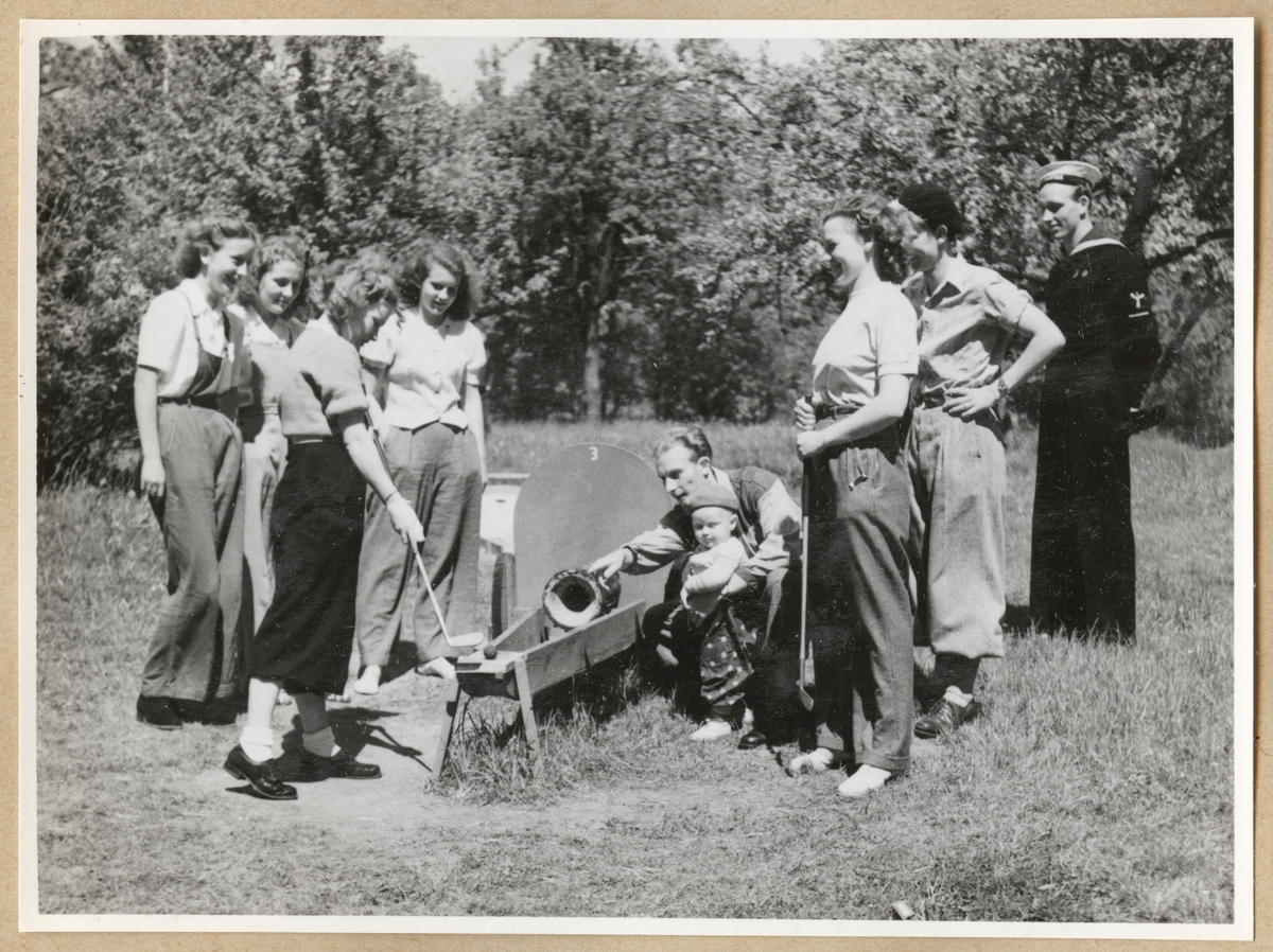 Unga kvinnor, klädda i byxor och blusar, står samlade vid en minigolfbana. Två av dem har golfklubbor i händerna. Närmast minigolfbanan sitter en man på huk med ett småbarn i famnen och pekar på golfbollen. Något bakom de andra står en uniformsklädd flottist, troligtvis en menig skeppseldare. Golfbanorna omges av grönskande träd.
