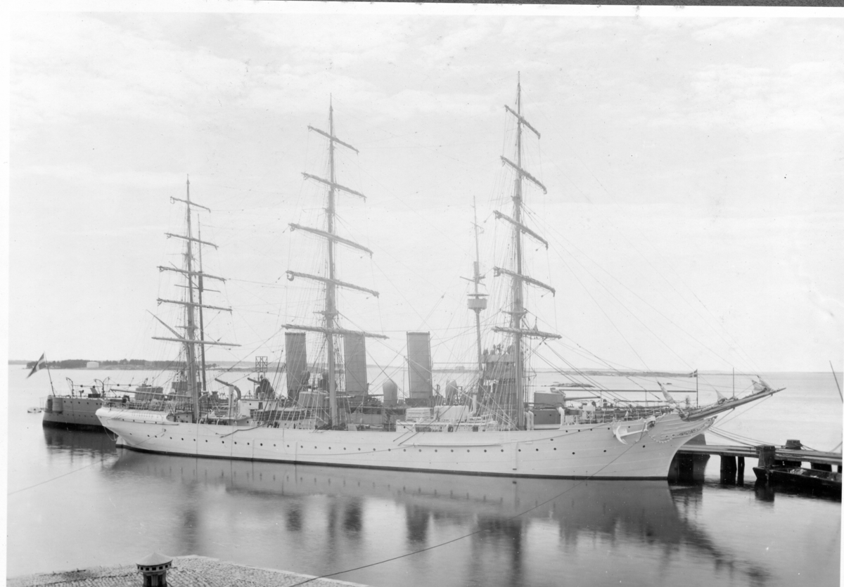 Titel: Övningsfartyget af Chapman och pansarkryssaren Fylgia liggande i laget.