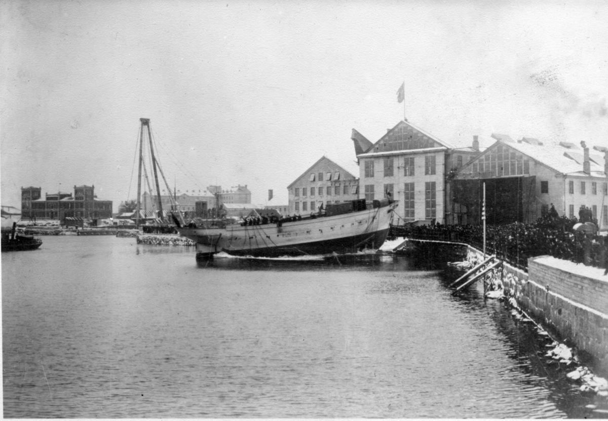 Titel: Övningsbriggen Jarramas sjösättning år 1900. Reproduktion