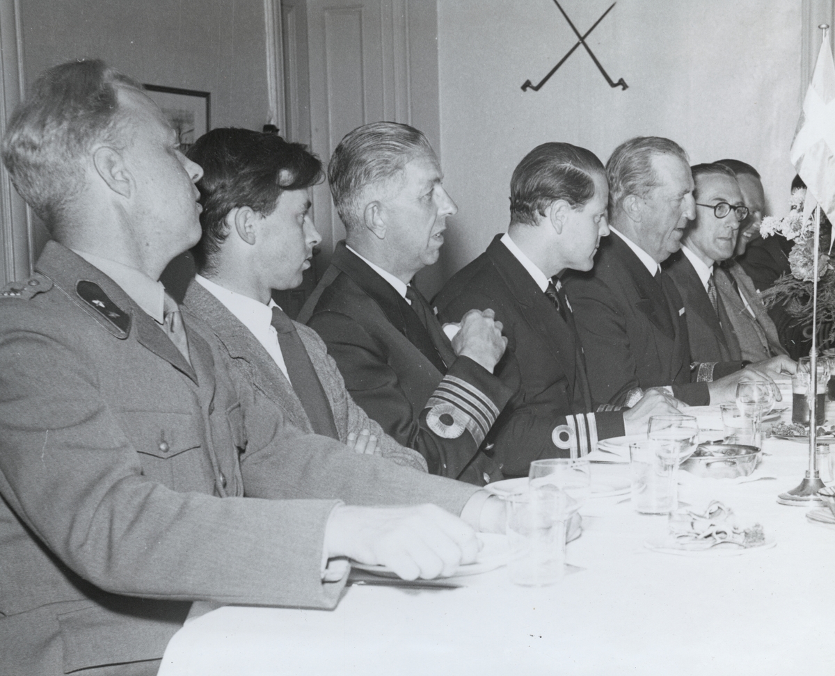 Militärer sitter vid ett middagsbord och har uppmärksamheten riktade åt höger, ur bild. Till höger i raden sitter konteramiral Samuelson. Männen är uniformsklädda och bland annat syns en kapten och en kommendör.