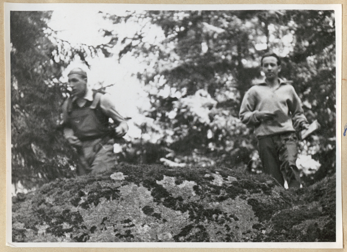Två civilklädda män springer i skogen. Den ena har en karta eller liknande i handen. I förgrunden syns ett stenblock med påväxt av mossa och i bakgrunden syns träd.