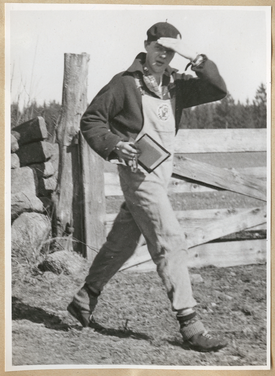 En man med karta i handen går över marken. Han skuggar handen för ögonen. Bakom honom syns en åkergrind och en bit av en stenmur.