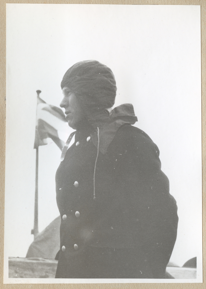 En man i profil står framför kameran i militär uniform bär en regnhuva på huvudet. I bakgrunden syns en vajande Svensk flagga.