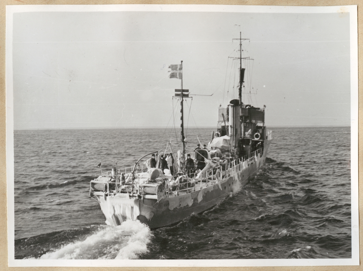 Titel: Vedettbåten Kaparen framförs över havet mot horisonten. Ombord på båten syns ett par besättningsmän.
