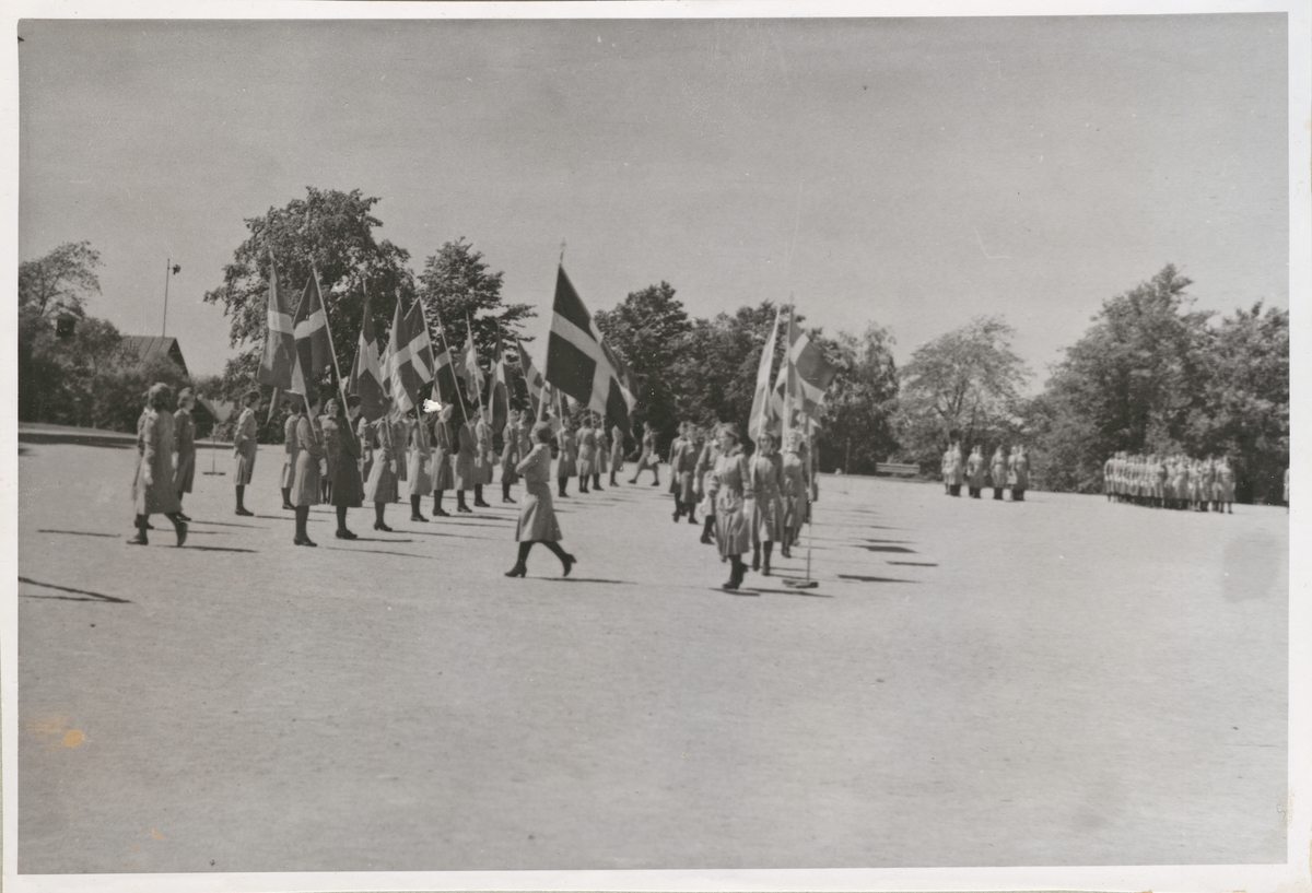 Uniformsklädda lottor på led. Flera av dem håller i svenska flaggor. I bakgrunden syns ytterligare lottor stå uppställda. Händelsen utspelar sig på en öppen yta som kantas av grönskande träd.
