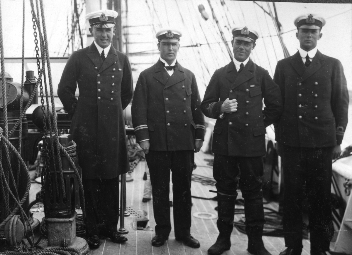 Titel: Fyra glada officerare på däck. Alla klädda i uniform.