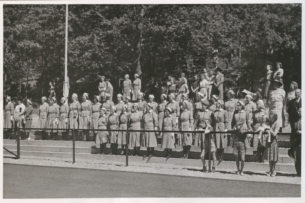 Uniformsklädda lottor står på gradänger vid en idrottsplats. Framför dem finns ett stängsel, vid vilket ett par barn, en kvinna och en man står lutade.