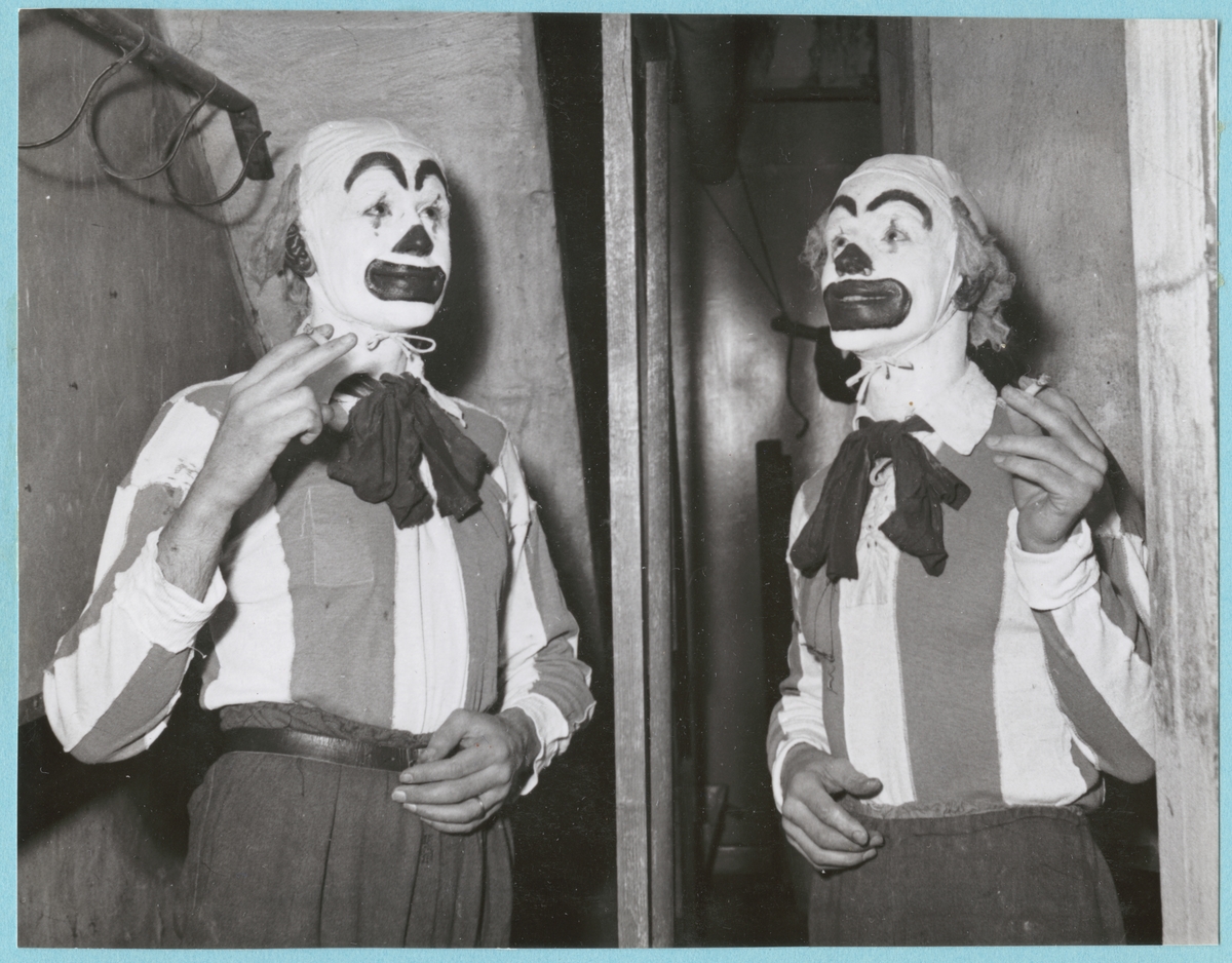 Bakom en scen står två människor i clowndräkter och clownsmink. De håller båda i var sin cigarett. Posten är daterad till 14-12-51.