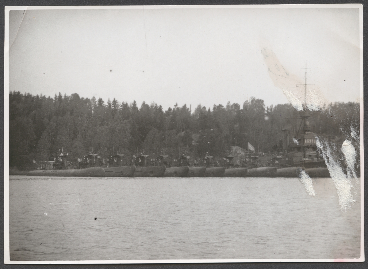 Titel: Tio ubåtar ligger förtöjt bredvid varandra vid kusten.