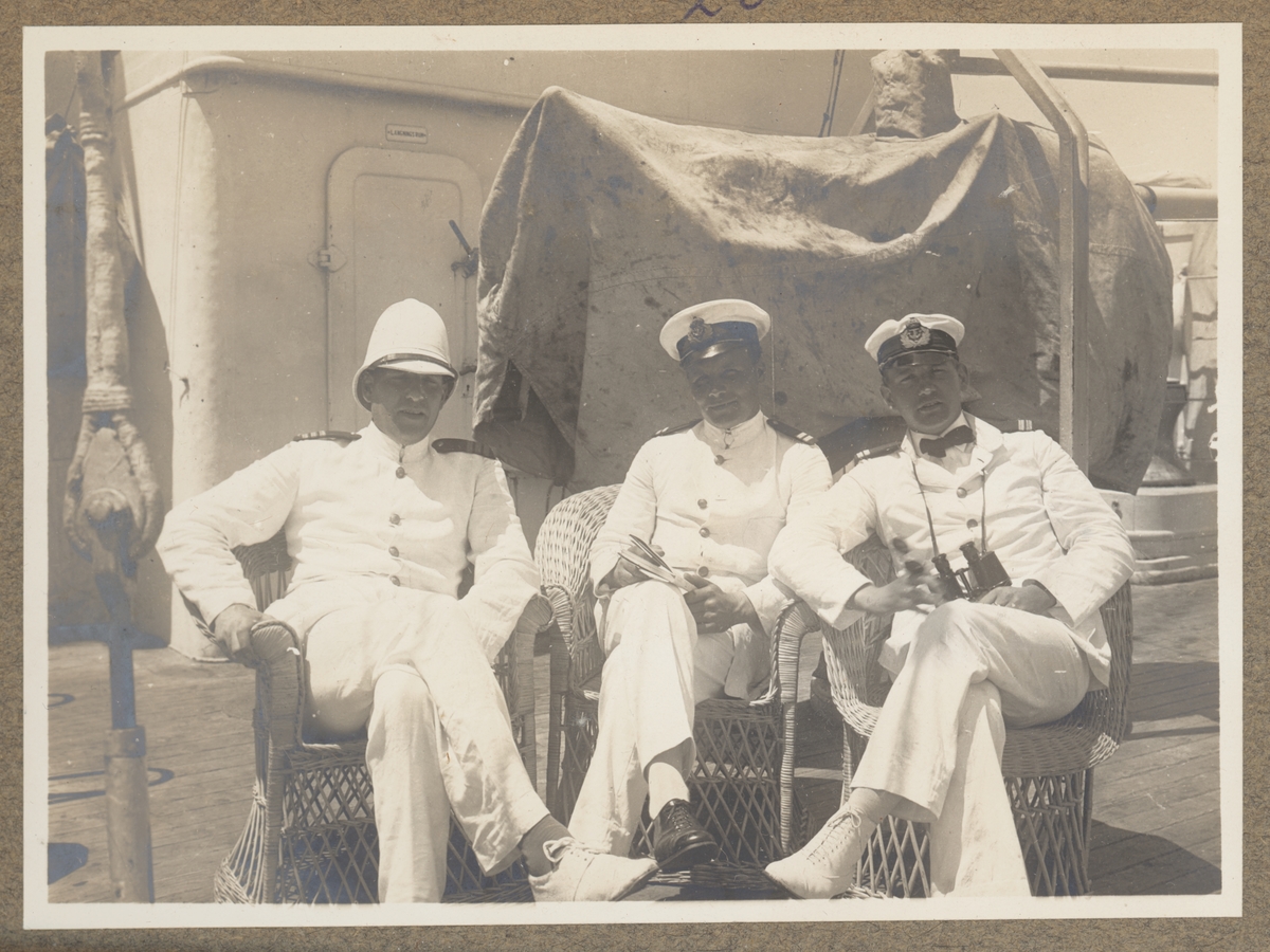 Titel: Bilden visar tre sjöofficerare klädd i vita uniformer och sittande i korgstolar ombord på Fylgia.