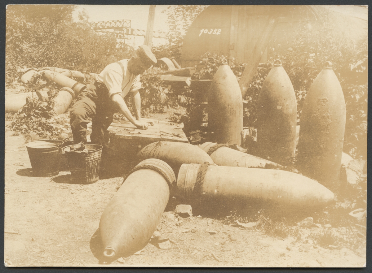 Bilden visar en soldat som verka rengöra en plagg av tyg eller läder på en låda. Bredvid honom står två hinkar och han är omgiven av stora artillerigranater som ligger lite huller om buller.