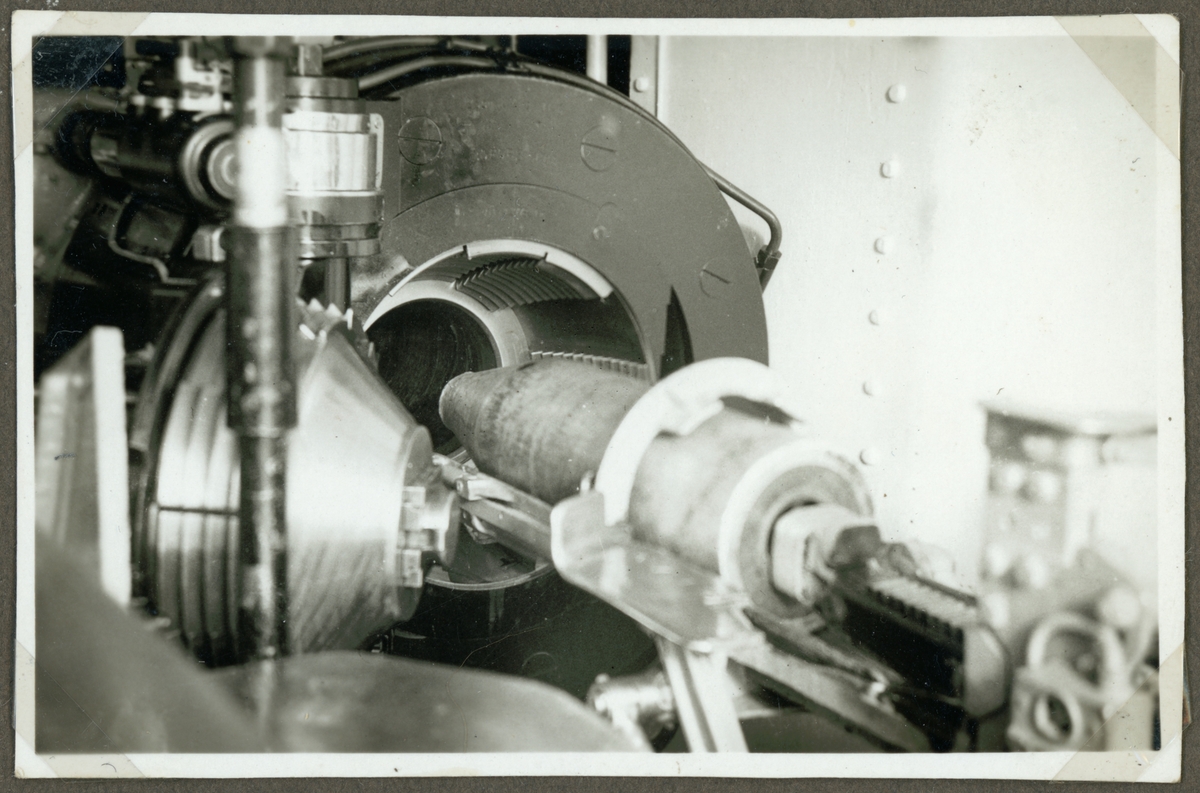 Titel: Bilden visar laddningen av en 15 cm kanon. Slutstycket är öppet och ammunitionen tillförs automatiskt.