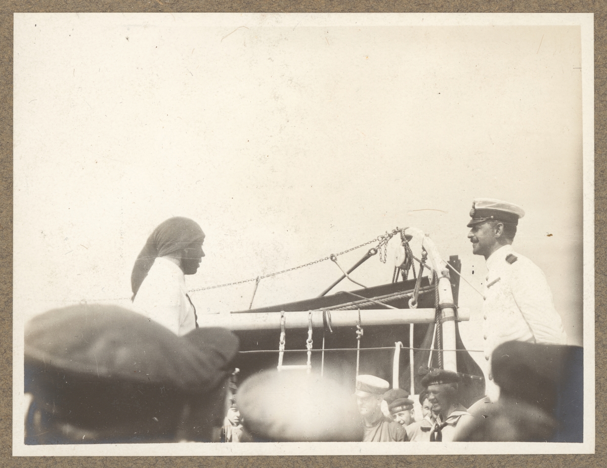 Bilden visar början av linjedopet ombord på Fylgia. En sjöman utklädd som löparnisse kungör fartygschefen att kung Neptun snart kommer ombord.