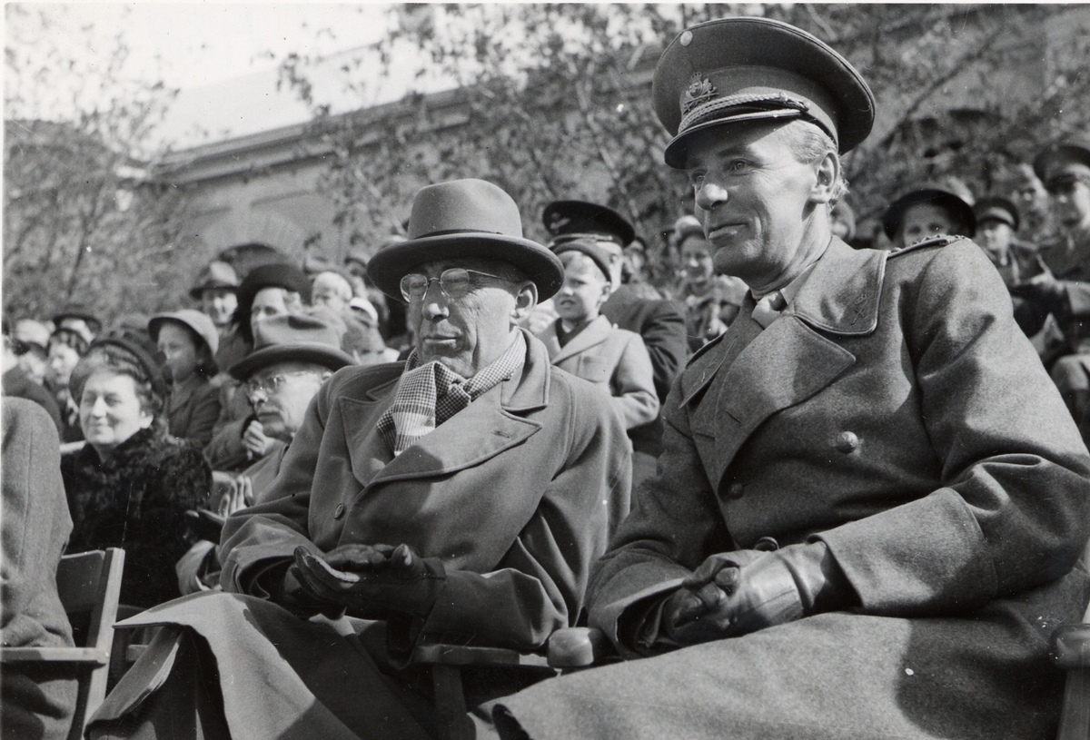 Försvarsminister Allan Vougt och överste Crevell sitter i publiken under uppvisning på Arméns underofficersskola (Försvarets läroverk) i Uppsala 1949.