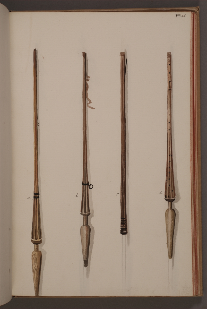 Avbildning i gouache föreställande standarstänger tagna som troféer av svenska armén. Ingen av stängerna finns bevarade i Armémuseums samling.