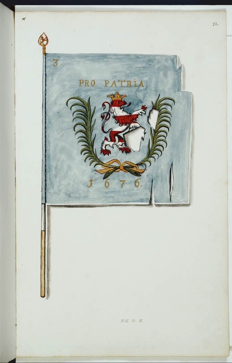 Titel: Avbildning i gouache föreställande fälttecken taget som trofé av svenska armén. Den avbildade fanan finns delvis bevarad i Armémuseums samling, för mer information, se relaterade objekt.