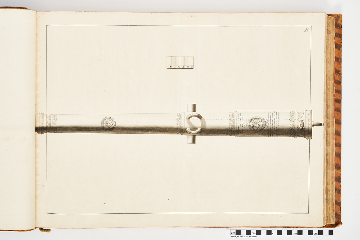 Avbildning föreställande gammalt metallstycke som legat på rikets fästningar, med Phillipus I monogram. Ingår i volym med avbildade äldre svenska eldrör förvarade på fästningar samt eldrör erövrade åren 1598-1679.