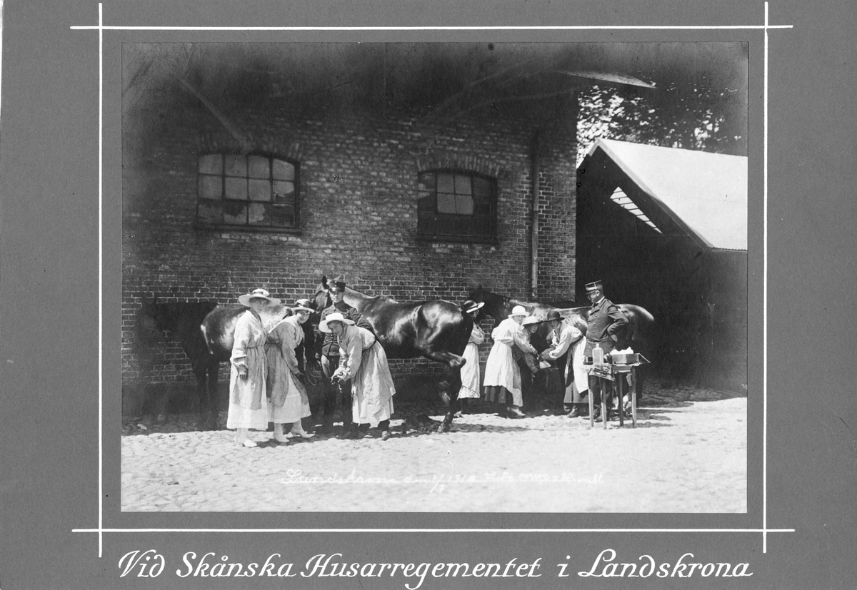 Titel: Skånska husarregementet K5 i Landskrona besiktning av hovar utanför stall byggnad.