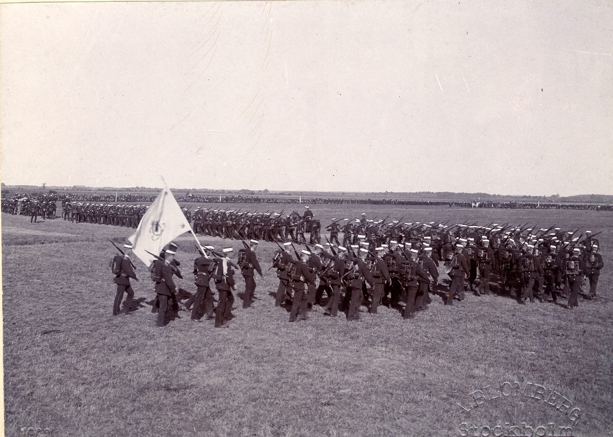 Göta livgarde I 2 ute på marsch 1902. Soldaterna bär uniform m/1886 och är utrustade med full packning. Längst bak går soldat med regementets fana.
