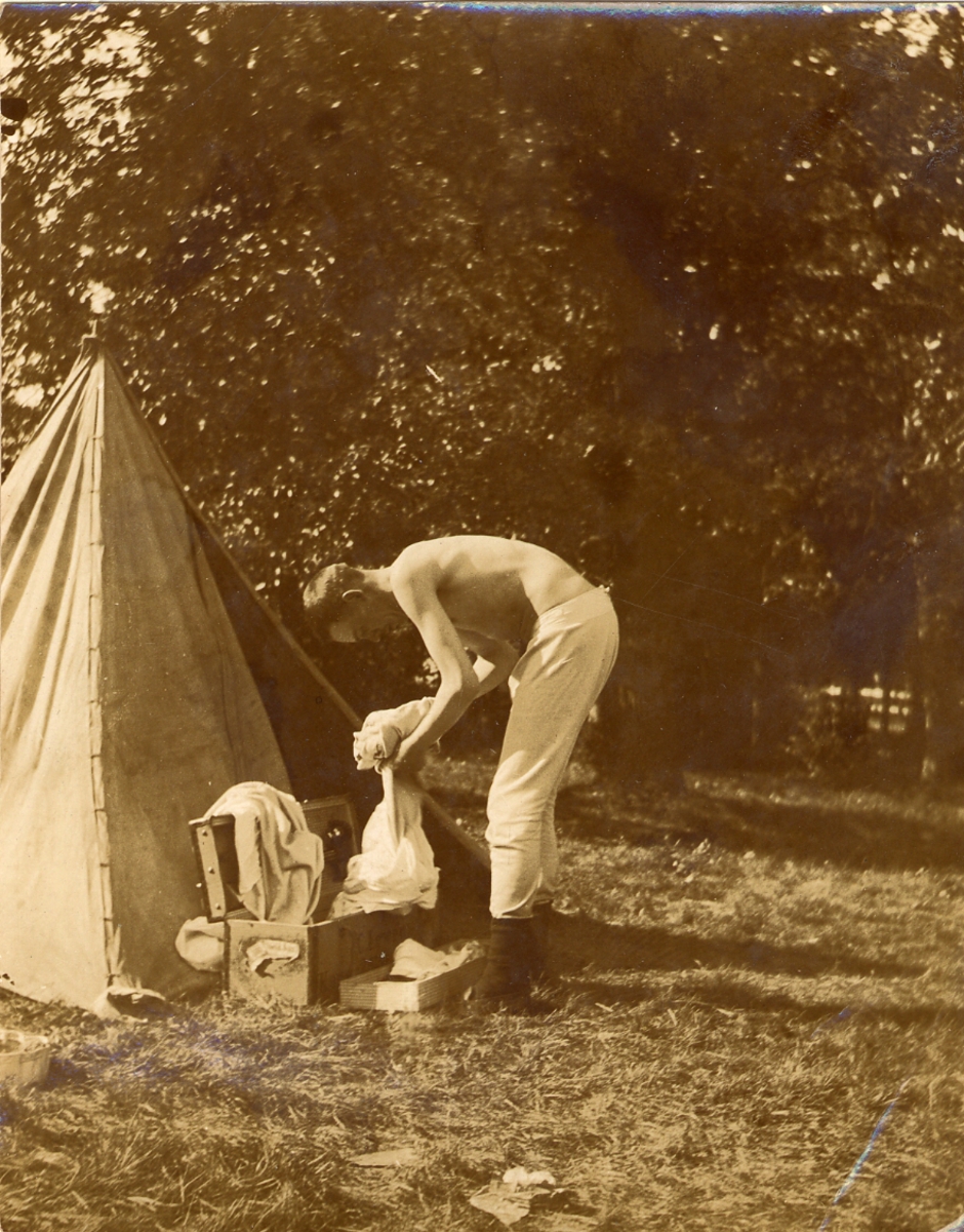 Titel: Soldat utanför tält utför fälthygien på sig själv.