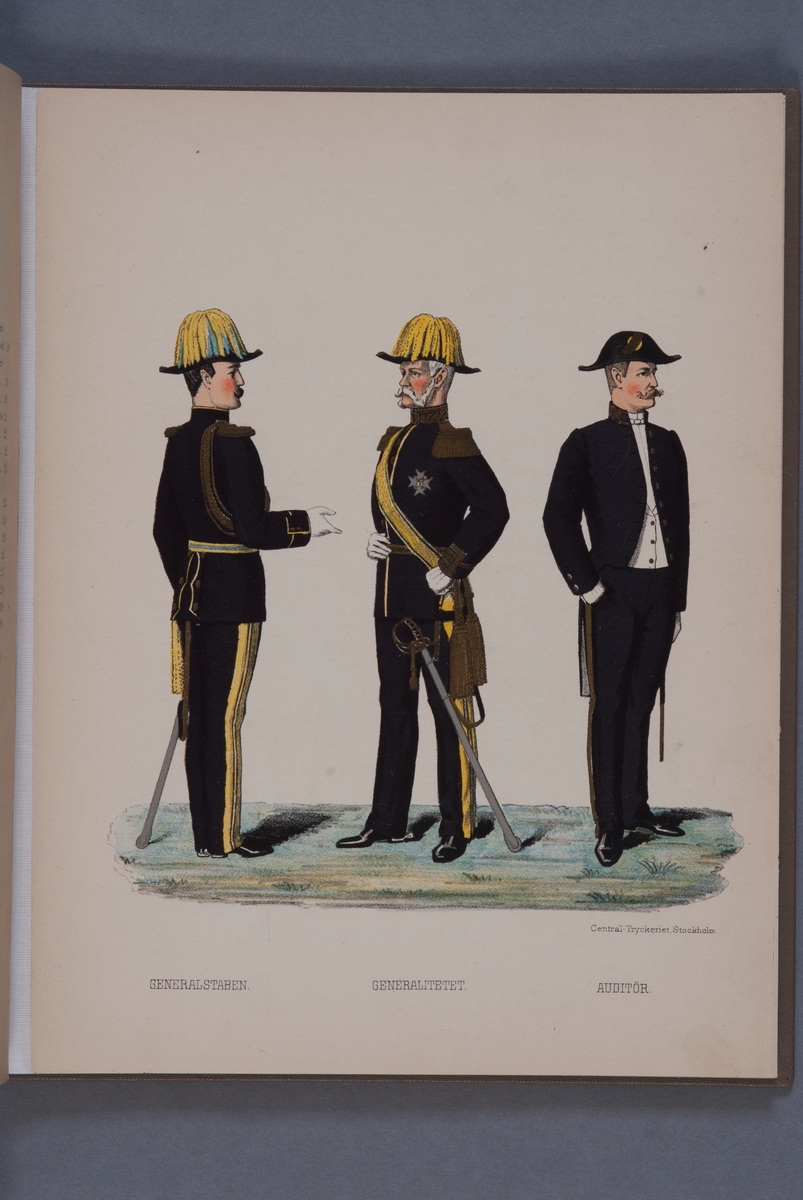Plansch i färgtryck med uniform för Generalstaben, Generalitetet och Auditör. Ingår i boken Svenska arméns och flottans uniformer, utgiven av P.B Eklund 1891.