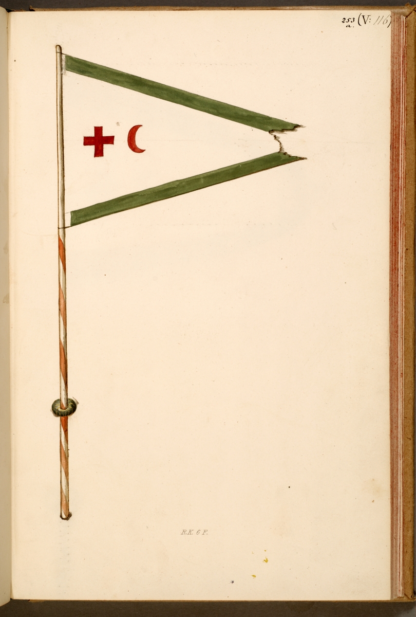 Avbildning i gouache föreställande fälttecken taget som trofé av svenska armén. Den avbildade vimpeln finns bevarad i Armémuseums samling, för mer information, se relaterade objekt.
