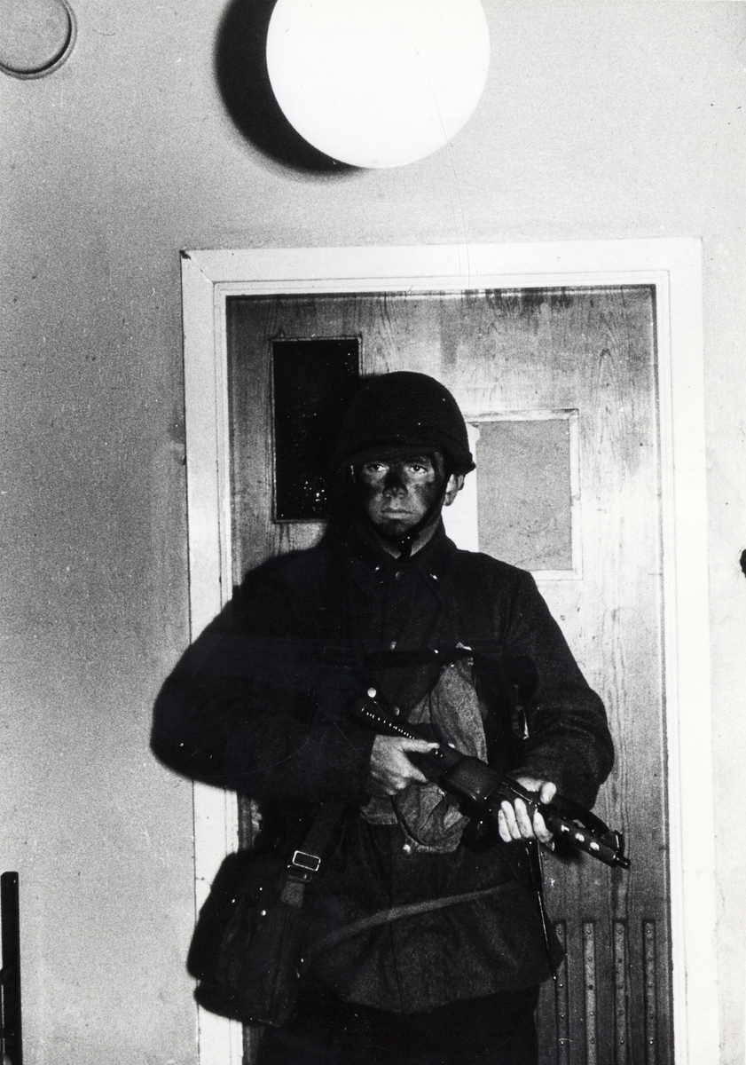 Stabsfurirskolan i Göteborg. Soldat rustad för utbildningskontroll.