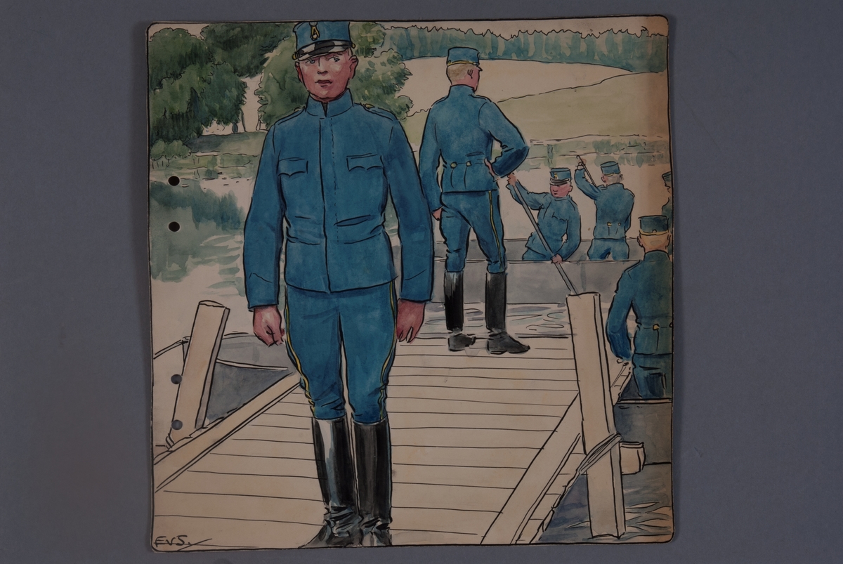 Brobygge med pontoner, teckning av Einar von Strokrich.