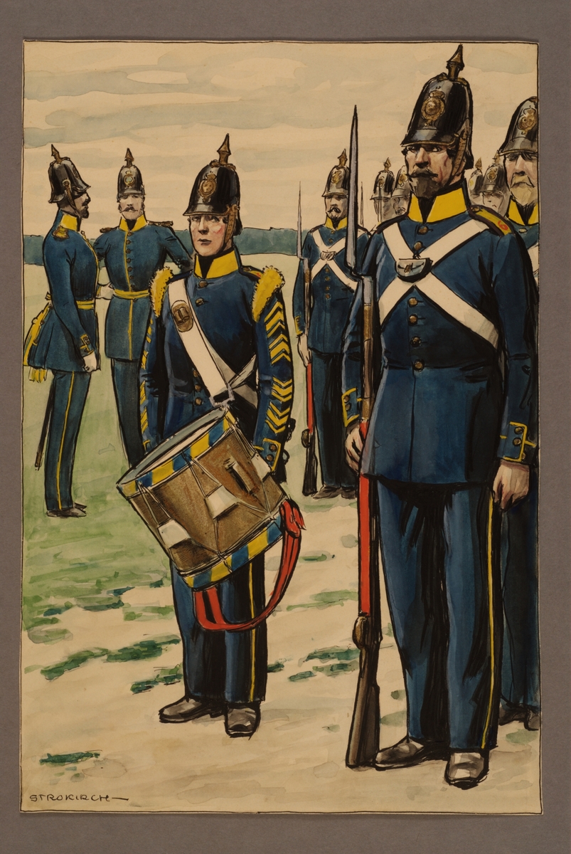 Plansch med uniform för officer och soldater vid Västgöta regemente 1845, ritad av Einar von Strokirch.