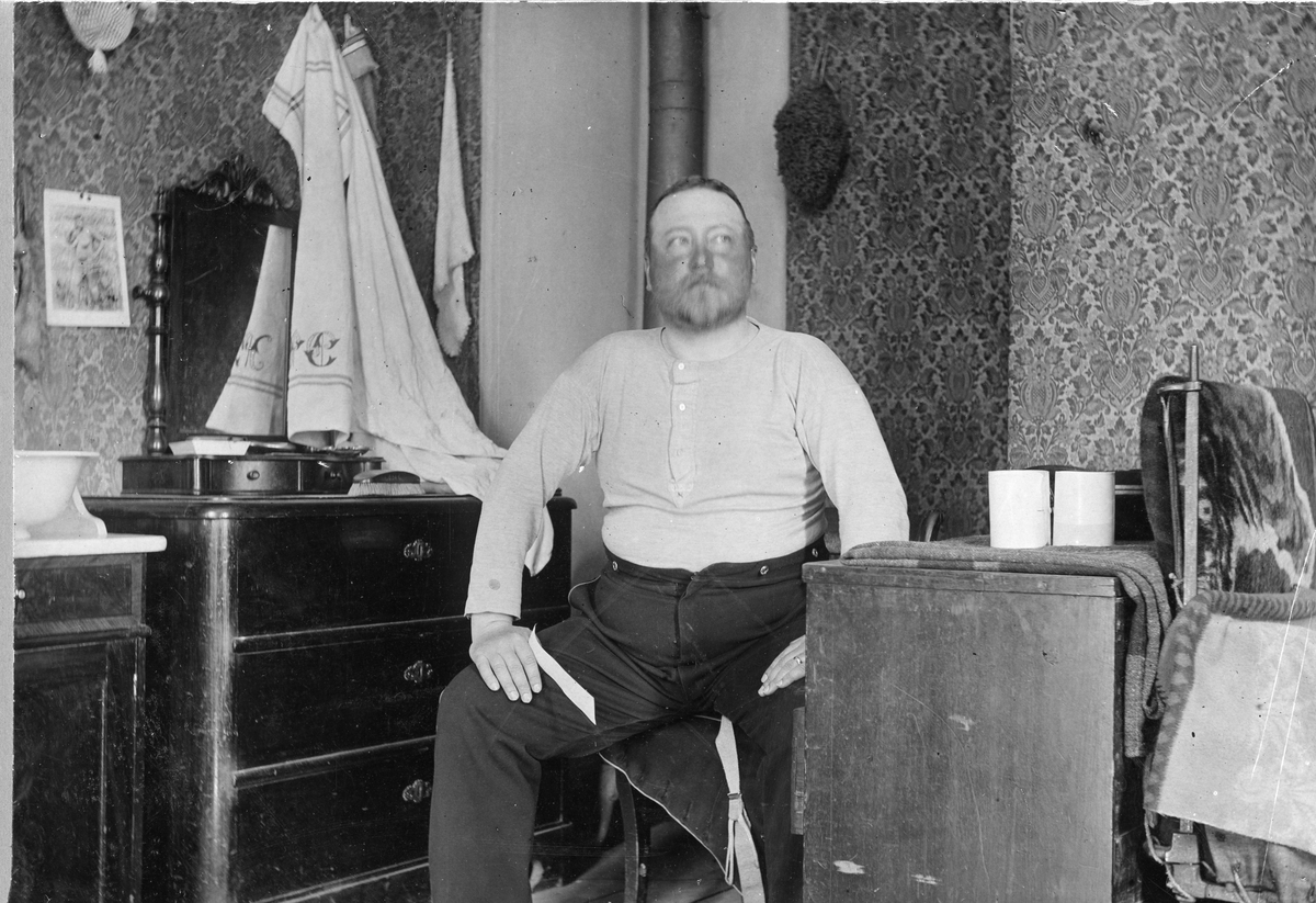 Titel: Soldat sitter på stol bredvid byrå i sovrum.