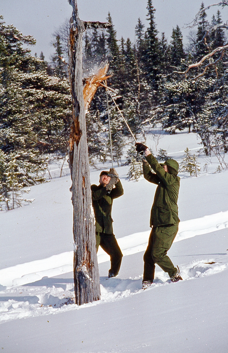 Titel: Värpliktiga samlar ved för att göra upp eld under vinterövning. I 21 Västernorrlands Regemente.