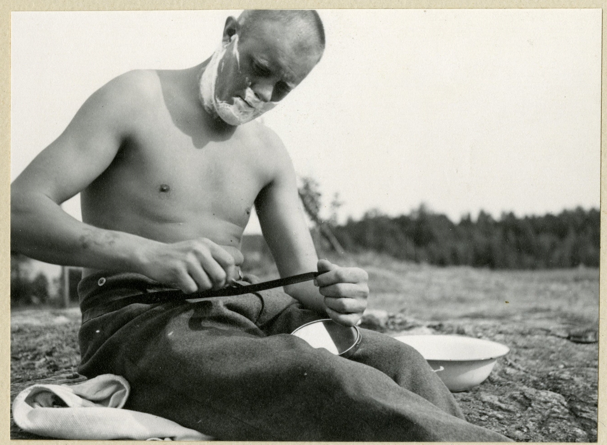 Titel: Soldat rakar sig på fält under beredskaptiden.