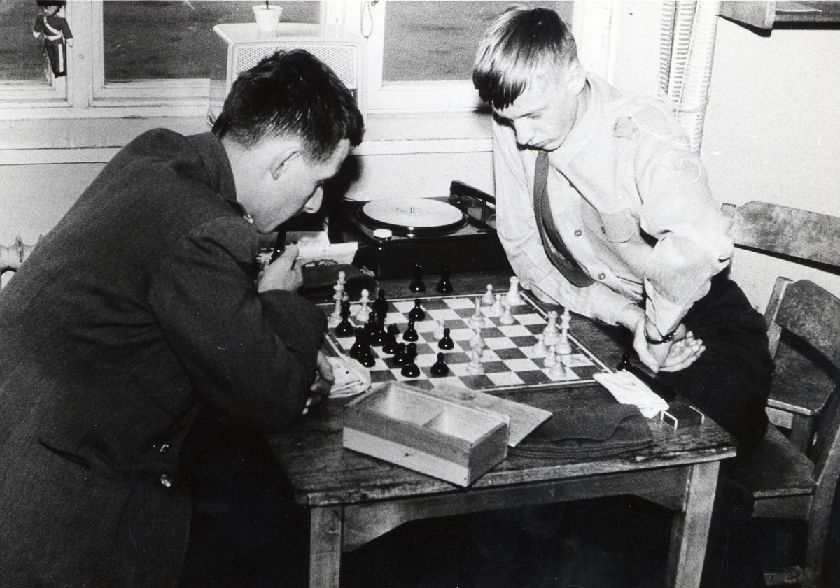 Stabsfurirskolan i Göteborg. Soldater spelar schack i logementet.