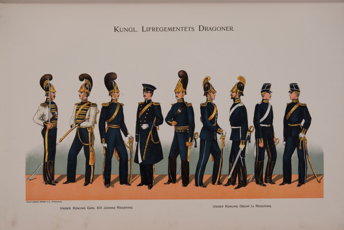 Plansch med uniform för Livregementets dragoner under Karl XIV Johans regering och Oscar I regering. Ingår i boken Svenska krigsmakten under konungarna Carl XIV Johan, Oscar I, Karl XV, Oscar II, utgiven av P.B. Eklund.