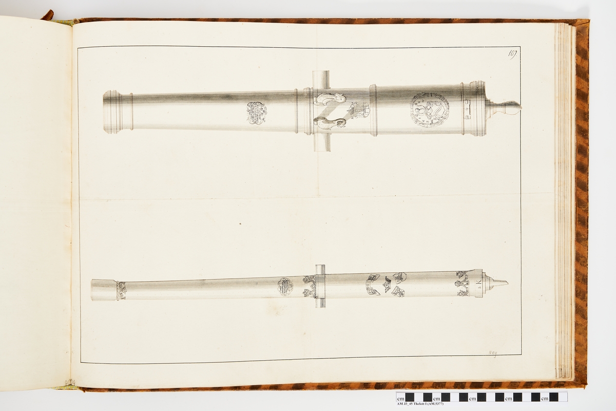 Titel: Avbildning föreställande eldrör tagna som troféer av den svenska armén i Kraków den 2 oktober 1702. Ingår i volym med avbildade kanontroféer tagna åren 1700-1702.