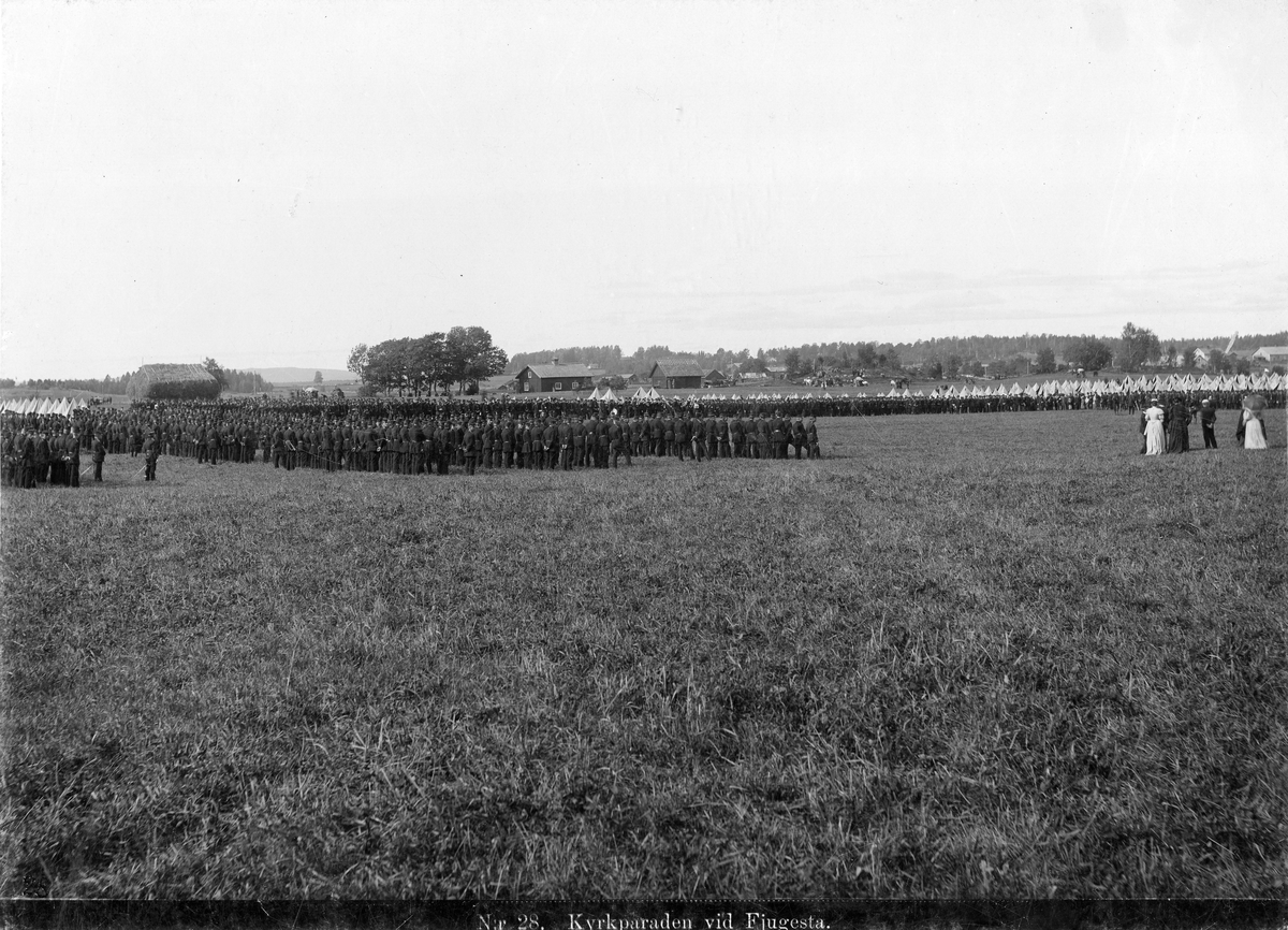Livregementets grenadjärer I 3 uppställda ute på fält under kyrkoparaden vid Fjugesta år 1900.