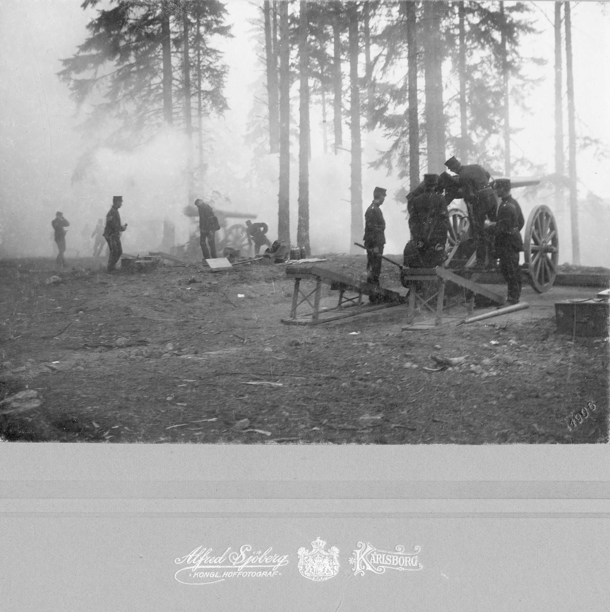 Soldater tillhörande Positionsartilleriregementet i Karlsborg övar med två positionsartilleripjäser i tallskog, tät krutrök eller dimma.